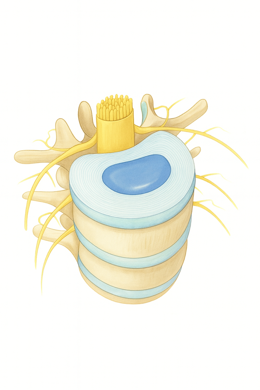 - Anulus fibrosus: Dies ist der äußere, faserige Teil der Bandscheibe, der aus mehreren Schichten von hartem Bindegewebe besteht. Diese Struktur verleiht der Bandscheibe Stabilität und schützt den inneren, weicheren Kern. Der Anulus fibrosus ermöglicht eine gleichmäßige Druckverteilung.