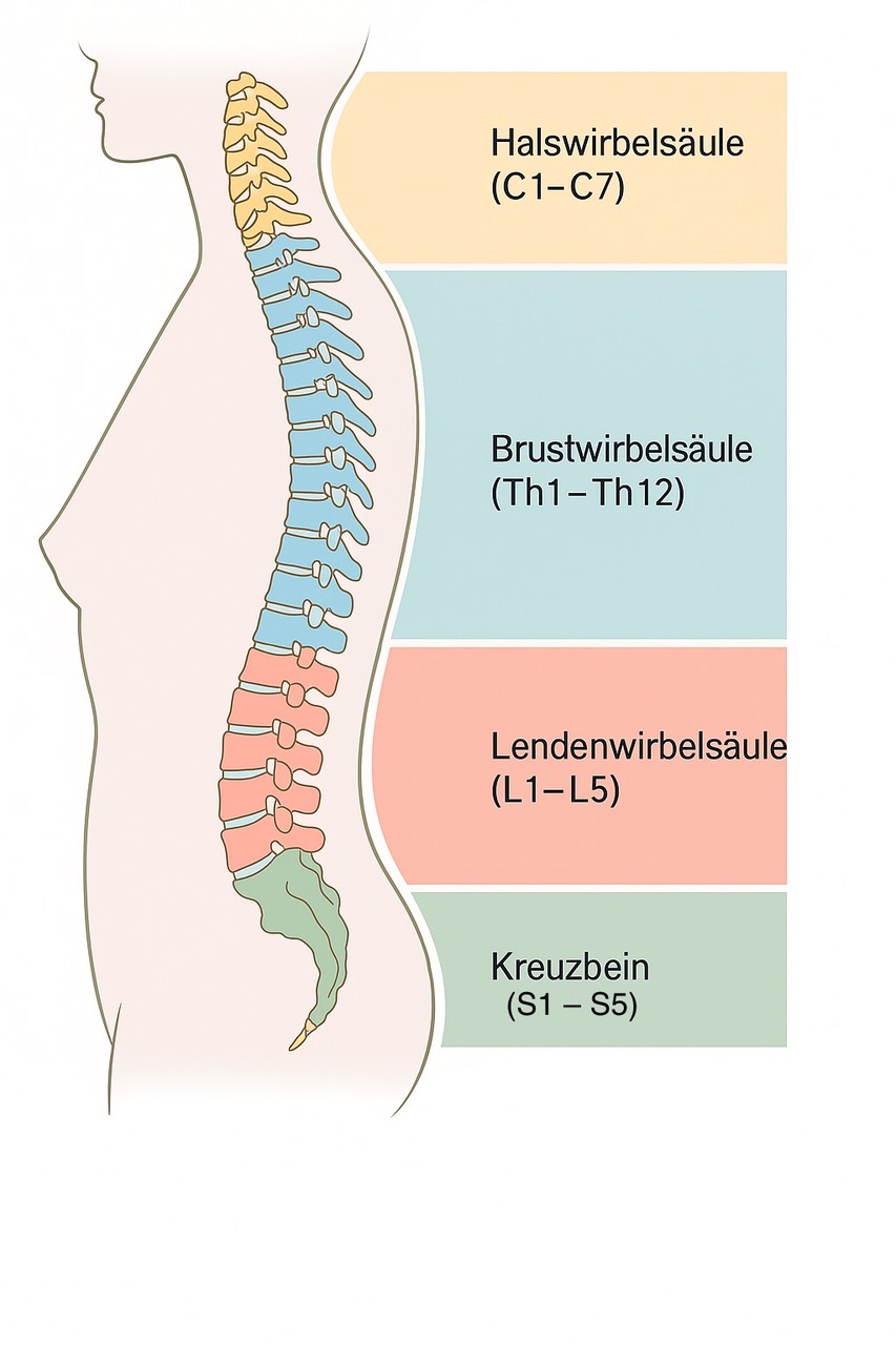 Die menschliche Wirbelsäule besteht insgesamt aus 24 Wirbelkörpern, die übereinandergestapelt und durch 23 Bandscheiben und Bänder miteinander verbunden sind. Diese wird in fünf unterschiedliche Abschnitte unterteilt: